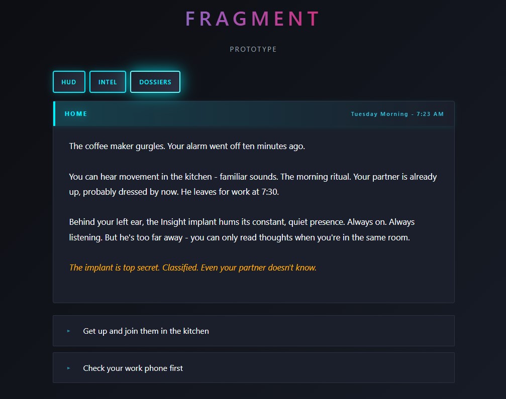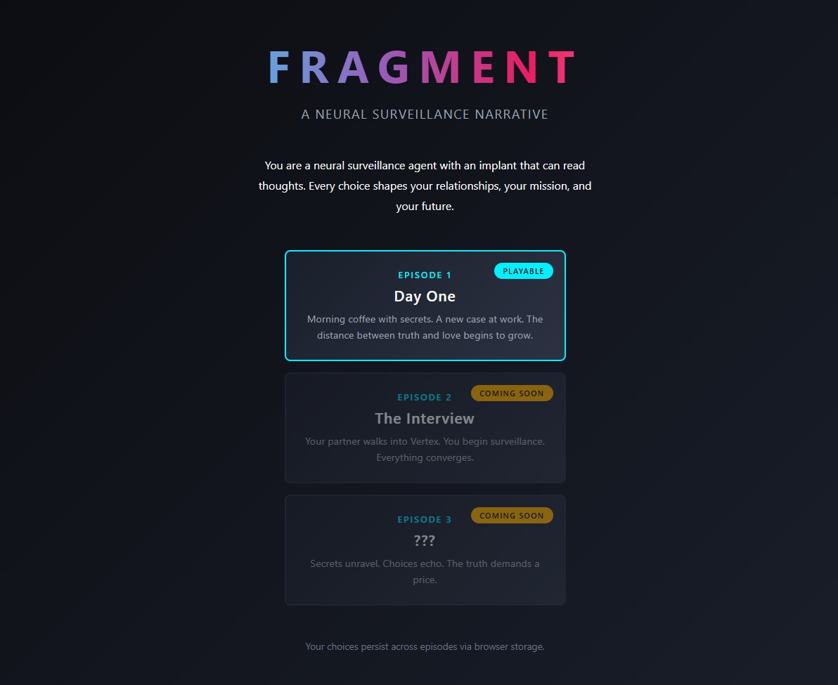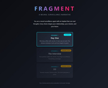Created by Romi Jade, Fragment explores surveillance, power, and identity, blending narrative tension with emotional depth to create meaningful interactive stories.