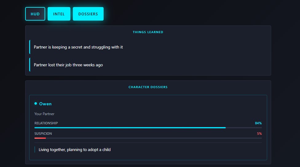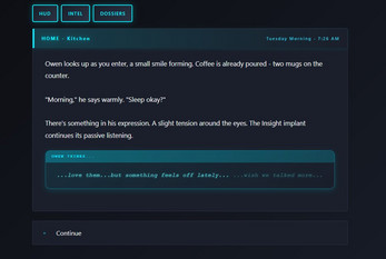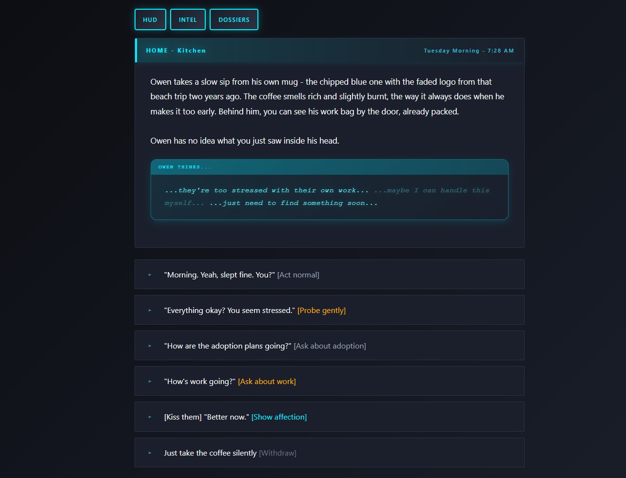 You are a neural surveillance agent using the Insight Protocol - a classified implant that lets you read minds. In 48 hours, you’ll face impossible choices between truth and loyalty, love and survival.